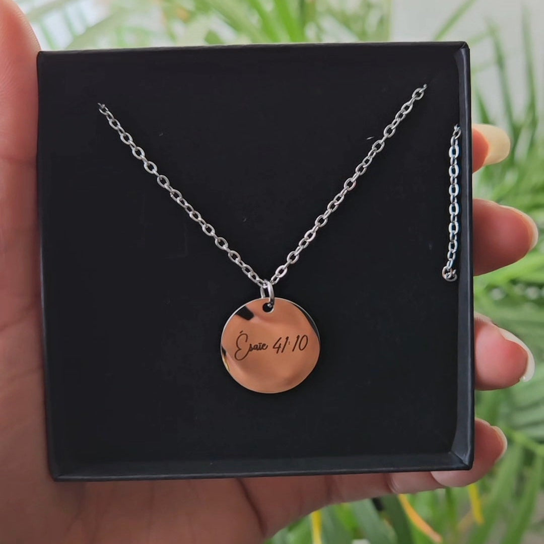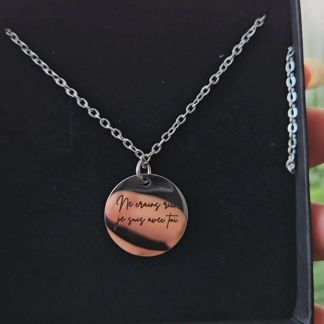 Comment ça marche ? Choisissez votre couleur préférée (Argent, Or ou Or Rose) Téléchargez une photo du texte/message/signature manuscrit(e) Ajoutez un message personnalisé pour personnaliser le dos du pendentif (optionnel) (vous pouvez ajouter n’importe quel texte, date, coordonnées ou symboles) Une fois votre commande reçue, nos designers professionnels commenceront à travailler dessus dès que possible pour garantir un produit de qualité et une livraison rapide.